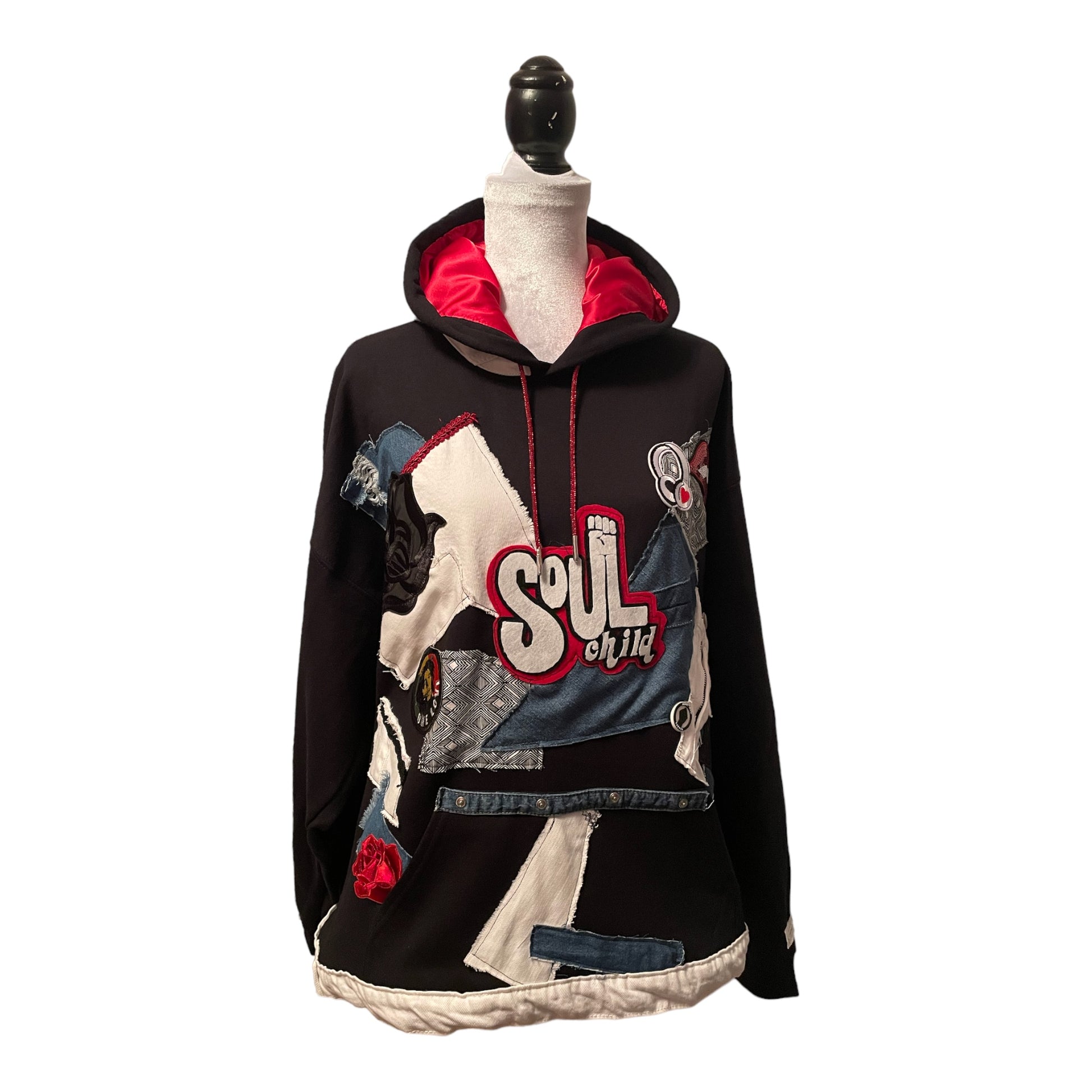 Elevate your off-duty look with this custom black, white, and red patchwork hoodie, reimagined with luxe details and soulful edge. Featuring a standout Soul Child patch, silky satin-lined hood, and shimmering rhinestone drawstring, this one-of-one piece blends bold streetwear with intentional softness.