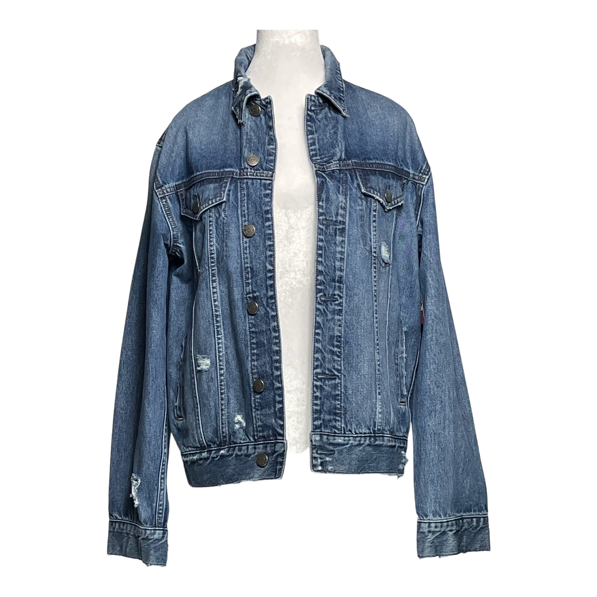 Make a bold statement in this distressed denim jacket featuring a powerful Black Panther image on the back. Each piece is uniquely reworked for that one-of-a-kind edge.