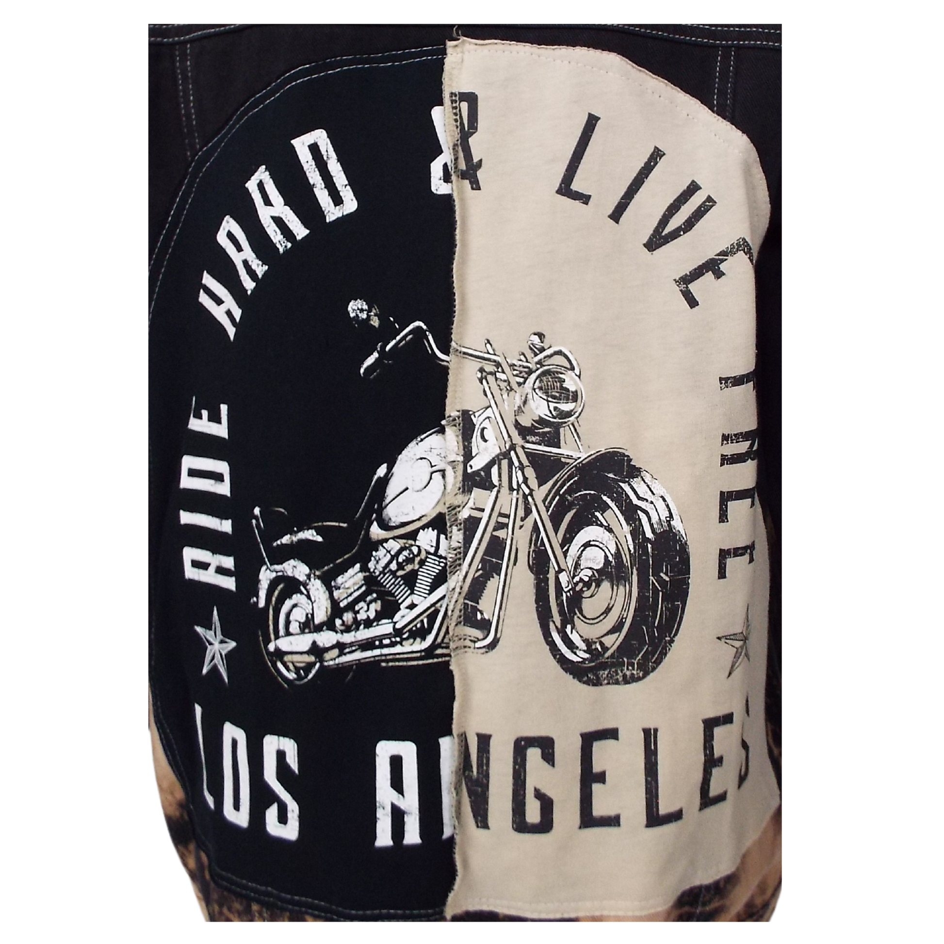 Make your entrance in the Freedom Rider Jacket — a reimagined moto-style denim piece built for rule-breakers and risk-takers. With custom bleach tie-dye, raw-edge distressing, hand-sewn silver accents, and a powerful “Ride Hard, Live Free” back patch, this jacket is more than a look — it’s a lifestyle.