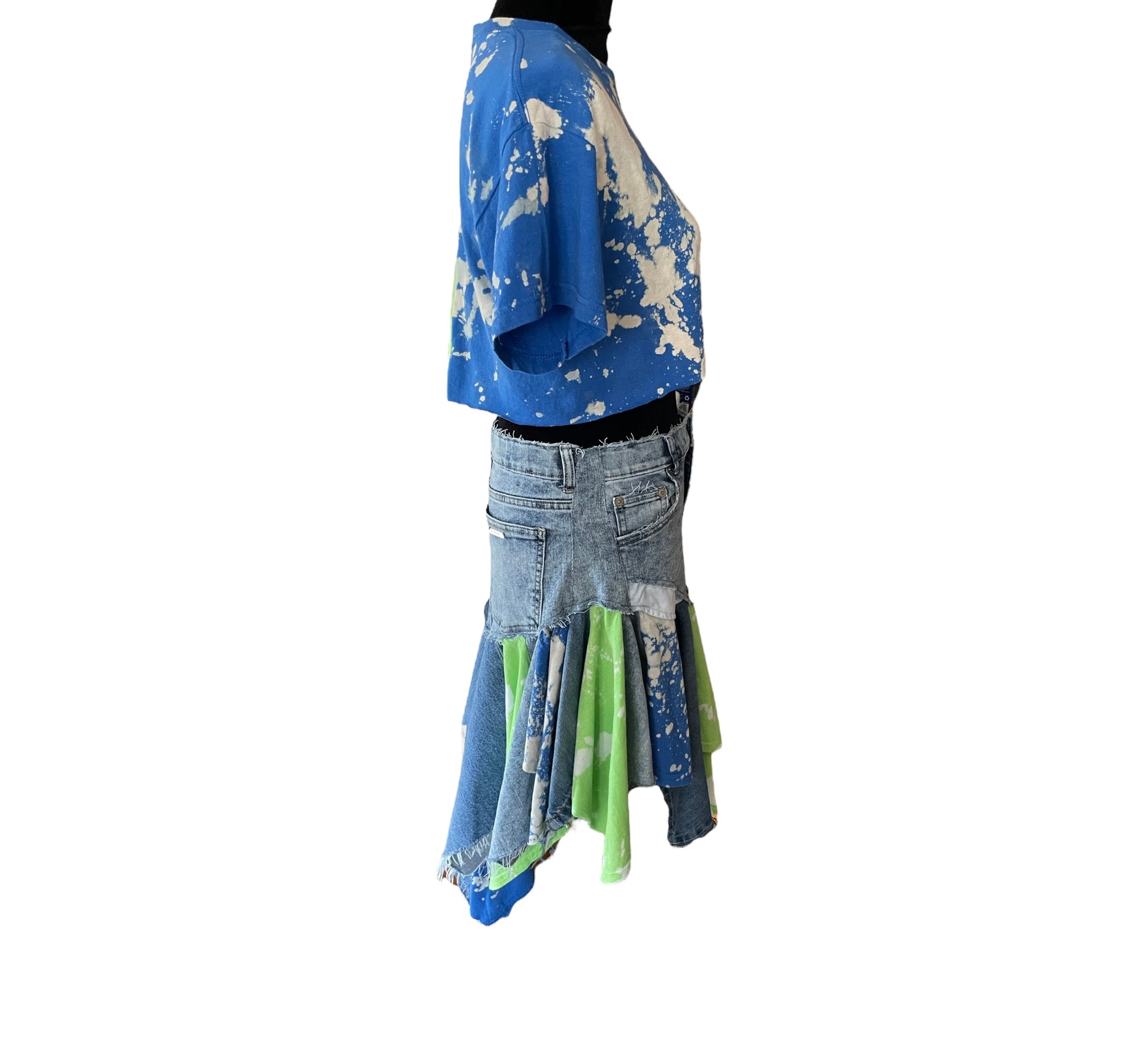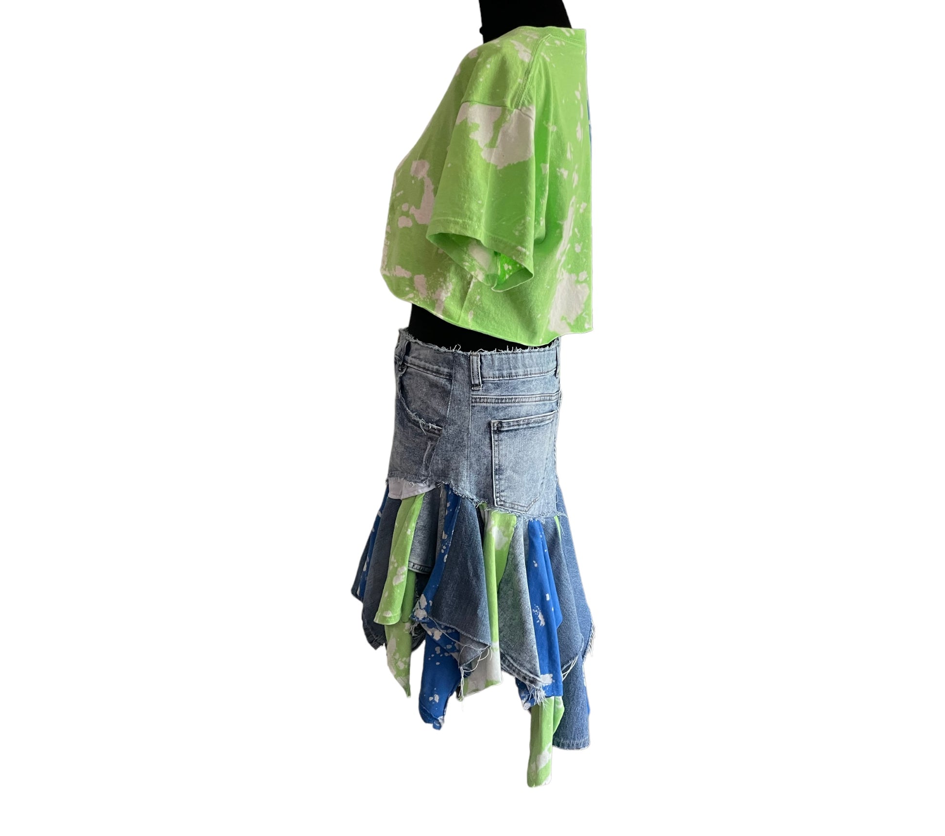 Mix up your summer style in this beautiful tie-dye skirt set! Custom half and half crop top compliments the matching custom denim skirt.